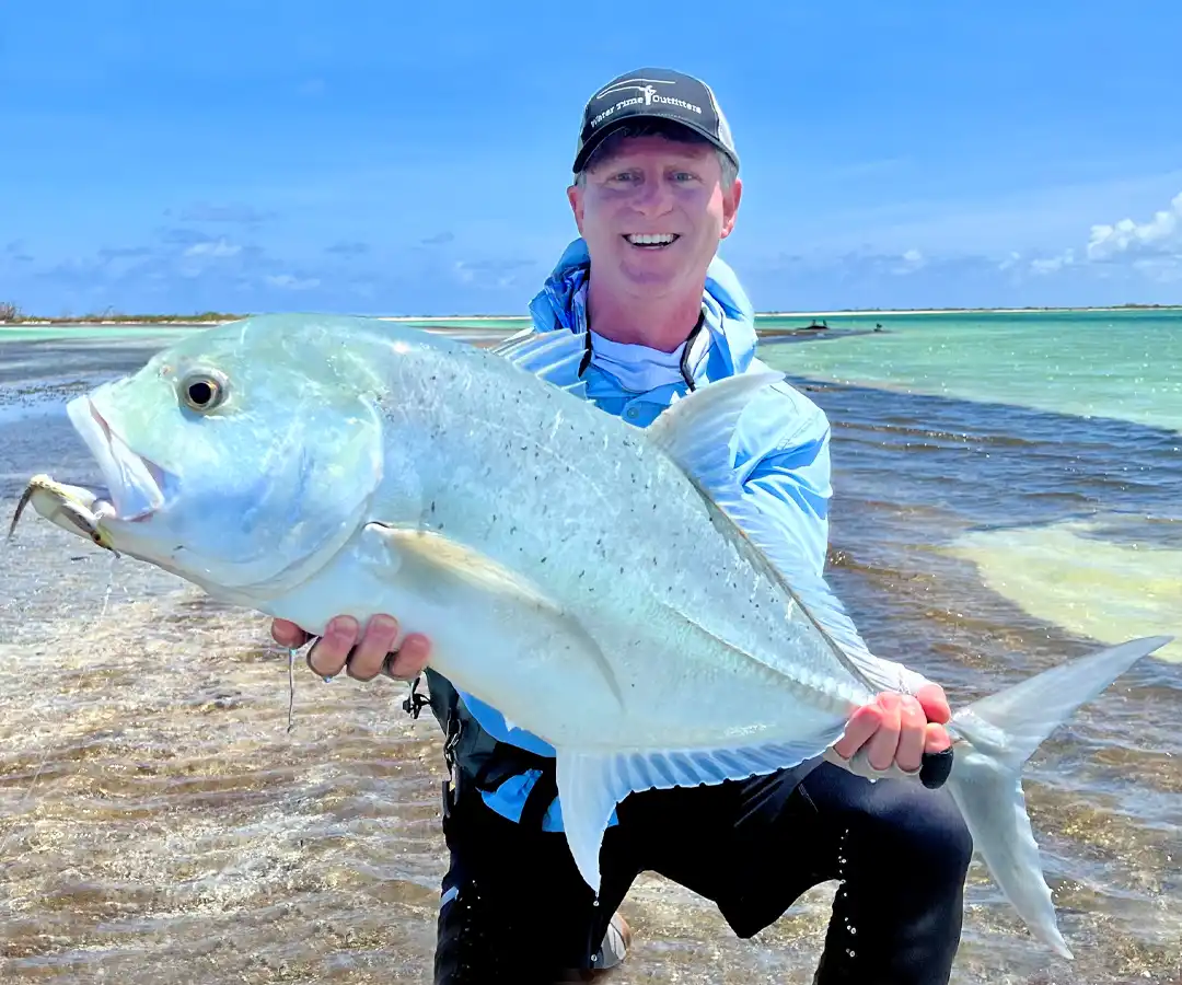 A 10 to 12-weight with a floating line is ideal for trevally on the flats. Just offshore and around the coral heads, you might consider a 12-weight or 14-weight outfit for giant trevally with sinking lines or 24 to 30-foot sinking shooting heads.